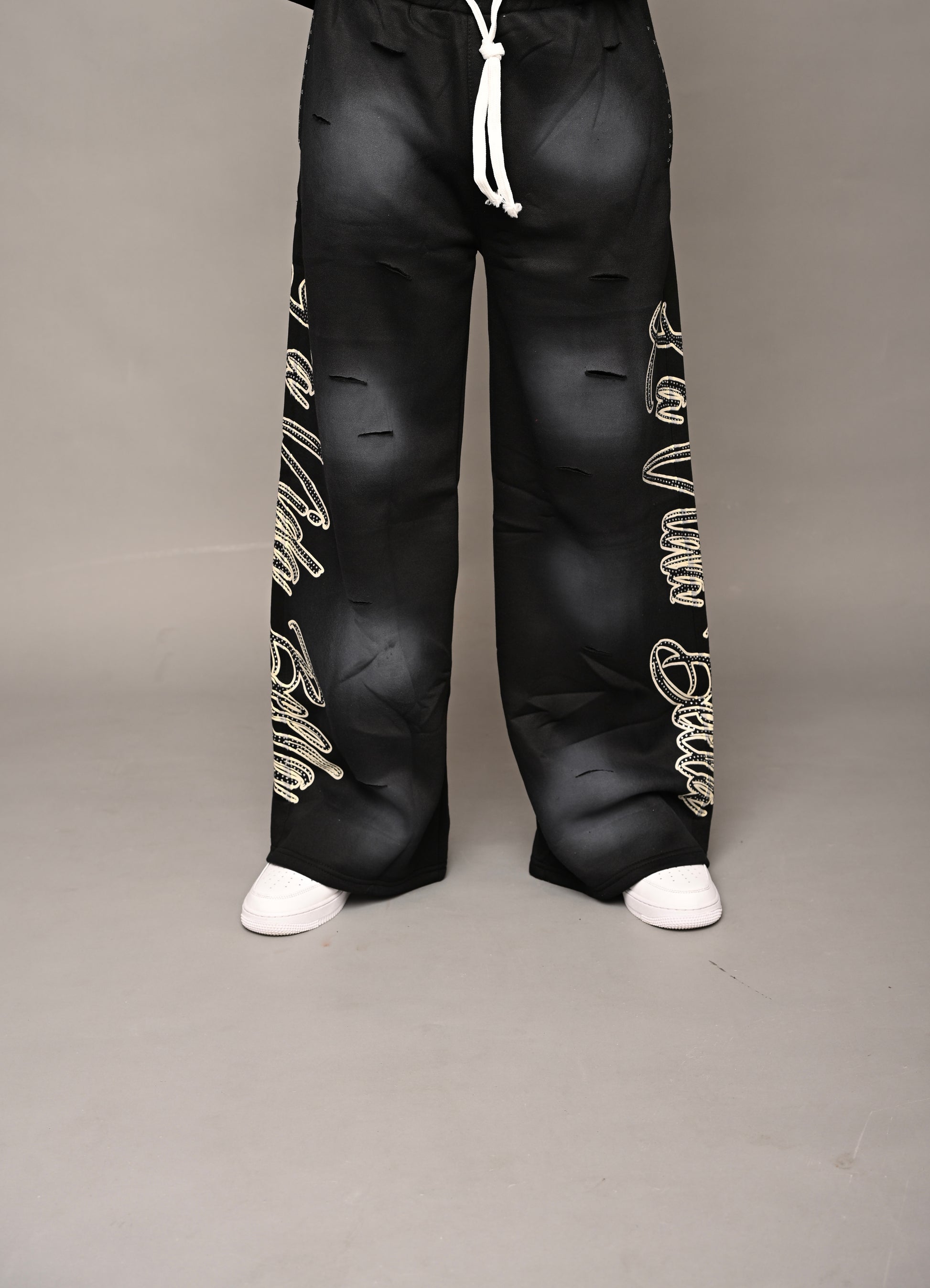 Oversized cotton fleece pants with distressed details and rhinestone “La Vida Bella” lettering down the leg. Streetwear comfort meets bold design.